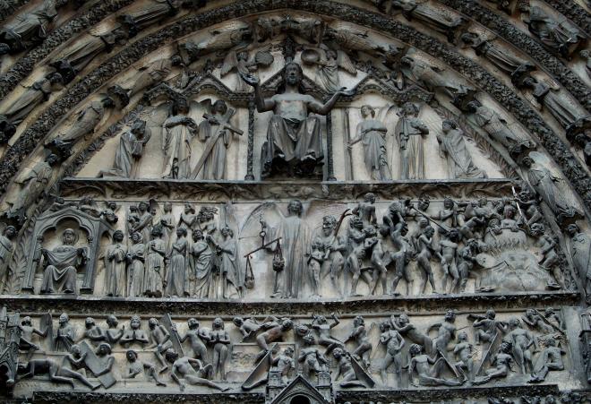 ▲中央部の最後の審判 中央に大天使ミカエルは微笑んでいる、向かって左側は選ばれた人々、右側は地獄に行く人々。下段は蘇死者たち、上段は審判者キリスト(受難の道具や聖母、聖ヨハネが刻まれている) |