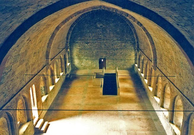 ![]() ▲大寝室の藁のベットで寝る。奥に見える階段は回廊、聖堂 の開口部。機能のみ |
