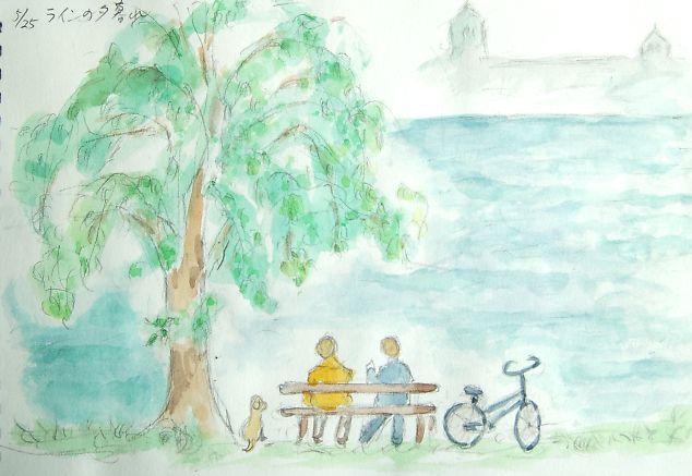 ▲ ラインのほとりは長い日暮れを楽しむ人たちが..