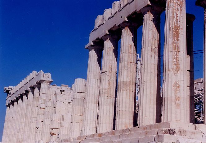 ![]() ▲パルテノンの神殿 神殿の基礎部分は、東西69.50メートル、南北30.88メートルあり、3段の階段状になっている。基壇に沿って周囲を囲むように、高さ18.5メートルのドリス式の円柱が建てられ、正面、裏面から見ると8本ずつ、側面から見ると15本ずつ配置され、神殿を支えているこの真っ白い大理石の色調は光の加減で微妙に変化する。午前中は赤く染まり、真昼の太陽では黄色身を帯、日が暮れてくると青っぽい紫色になる。 神殿の建つ基壇の最上部床面は、微妙なカーブを描いている。その床面の中央部は隅の部分より17センチ高くなっている。柱上の梁の部分も中央が6センチ高く、弓なりに反っている。円柱の直径は柱の位置によって異なり、正面中央部では下端の直径が1.9メートルであるのに対し、隅の柱は1.94メートルと若干太くなっている。また全ての柱が数センチずつ神殿の内側に傾いている。このように神殿全体が、微妙な曲線を持って構成されていて壮大な神殿が重圧感を与えるのを防いでいる。アテネが最も輝いた時期の「神殿の中の神殿」は確かな技術と高い芸術性で満たされている。 |