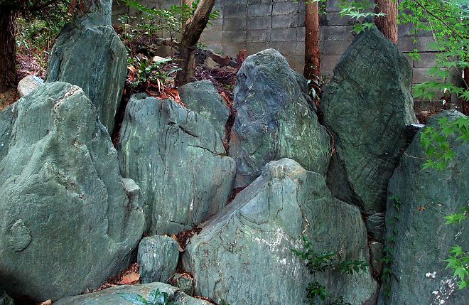 ![]() ▲三尊石 (中央:高さ22cm・最大幅90cm・厚さ60cm、右側:高さ120cm・幅70cm、左:高さ145cm・厚さ100cm) |