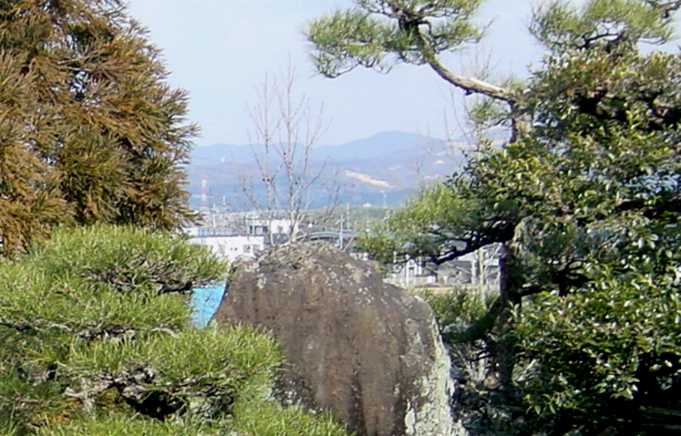 ▲酬恩庵 生垣の後ろにはあたかも円通寺の景色のように、遠く京都の連山が望める。 ▲酬恩寺 観音石の後ろには比叡山をはじめ連山が望める。しかし昨今の無造作な宅地造成のため木立による遮蔽を余儀なくされ、連山が一望できなくなった。 |