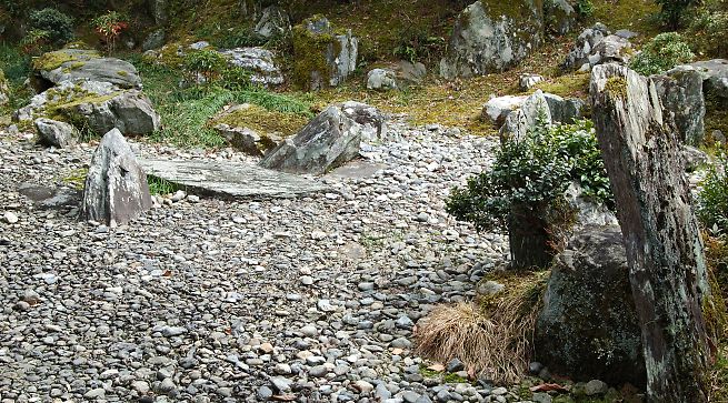 ![]() ▲中央左側の石を一本の白い橋に見立てるならば、栗石は怒りや恨みが渦巻く火の川と、貪欲が荒波となる水の川という煩悩の二河が流れている。しかし阿弥陀の世界に行きたいと願う清浄で強い願いがあれば煩悩の河を渡ることができる。阿弥陀の世界への船出がテーマ。 |