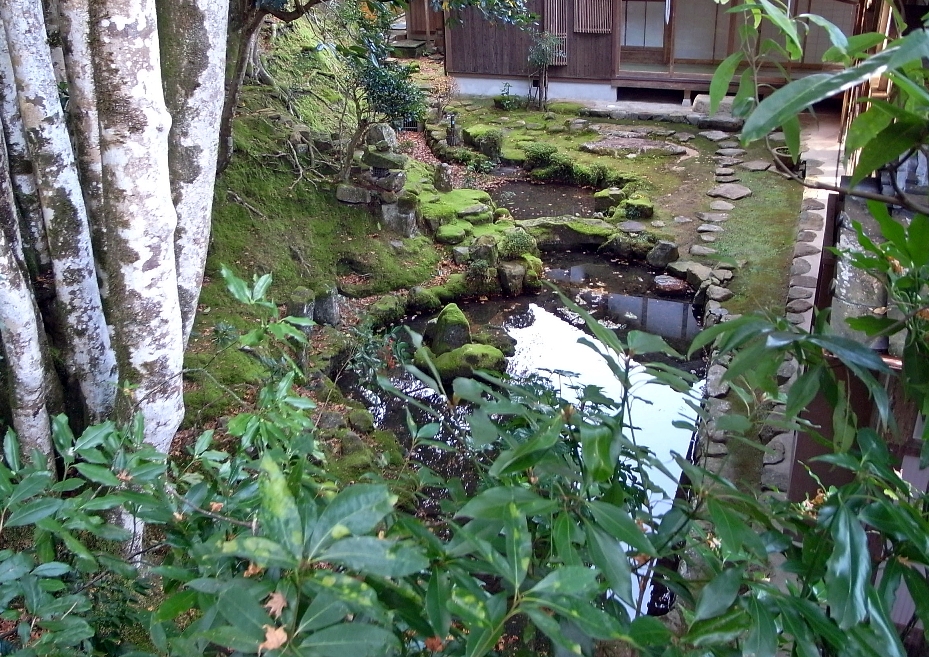 池泉は、滝を龍頭に見立てている。出島の先に斜めに組んだ石が亀頭石で、亀が蓬莱山を背負った造形である。