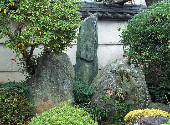 | 庭園 当家には母屋の前に庭園があったが、先代の当主が書院を作る際に重森に造園を依頼した。母屋と書院の間にある空間は以前からの石や多宝塔、蹲を採用している。施主の愛着のある石や石造美術は利用しているが、庭園中央部は紀州の緑泥片岩(青石)をふんだんに採用している。更に重森が頭を悩ましたのは書院前の門であろう。書院から見て門へは飛び石が打たれているが、庭園を左右に分断する印象を与える。 一方母屋から庭園を眺めると、手前に以前よりの石を利用した前庭があり、右側には石造多重塔を取り囲むように石が組まれている。更に、正門の奥には巨大な蓬莱連山が連なり、正面には印象的な三尊石が見えなかなか壮観である。書院の前には神仙思想に基づく小さな島があり、その間を白川砂による流水が流れている。流れの途中には舟石や水分け石、岩島が施されている。 庭園は従来の日本庭園的要素を含むが連続的な立体造形で重森ならでの景観である。一方、書院前の葺き石、蹲の造形は完全に重森の世界である。葺石の間の溝は深くて幅も大きく、更に目地は弁柄で彩られ画家を目指した重森の世界である。 |