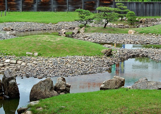 | 平城京から昭和50年に発掘され、現在見ることが出来る最古の庭園である。この庭は天皇家か、その一族に関係する曲水宴遊の施設と言われているり盃を流し、面前を過ぎるまでに詩を作って詠み、盃を干す酒宴である。蛇足ながら「お流れを頂戴」とは「上流にいる上席者が故意にパスして末席者に酒を回す」から来ている、とのこと。さて、庭は総て敷石が敷き詰めてあり、水が澄み且つどこに座っても衣服が汚れないようにしてある。また、川幅は2mから6mでくねくねと蛇行した川の長さは55mもある、とのこと。 関連庭園としては松尾大社の曲水の庭、城南宮における現代の曲水の宴が有名だ。 |