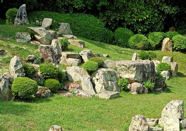 ![]() 軽快なリズムで石組は築山の須弥山石に向かう |