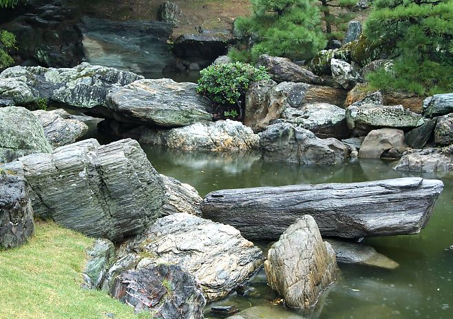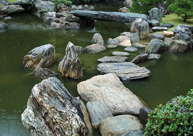 ![]() ▲仙人の住まう蓬莱山(鶴島、亀島)には直接橋が架かる。このような風潮は桃山時代の特徴 手前から亀島に架かる橋の石は皺があり湾曲していて、洞窟状になっている。仙人の住む蓬莱山の雰囲気。亀島は多孔質の石で覆われている。 |