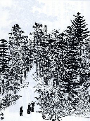 ![]() ![]() ▲1799年の「都林泉名勝図会」に描かれた真如院庭園 奥行きが現在の庭園の倍以上あり、鱗状の波が眼前に迫ってくる。橋は中央に架かっているが、源流は右奥のようである。 |