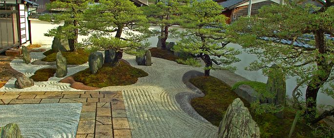 | 庭園 日本庭園には蓬莱山思想に基づいた神仙延年の庭が多くある。しかしこの庭ほどそのテーマにピッタリの庭は無いのではないか。というのはこの地には浦島太郎伝説である。それは近くに丹後松島があり、如何にも穏やかな竜宮がありそうだ。 この庭の構成を以下に列記すする。 @重森は当庭に四島を作ったが、漢の武帝が大液池に蓬莱、方丈、瀛州、壺梁の四島を作ったのに因んでいるのだろうか。 A島の際は白い白川砂と赤い出雲砂で変化をもたせ、日本海の海岸美を表している。州浜模様のテラスと踏石は鞍馬の錆色の石を使い造形している。 B浦島とは切り離せない五本の松は重要な要素のため、丹後地方の松を探したが重森のイメージに合うものが無かったので、わざわざ高松郊外の鬼無から運んだもの。 C青石(緑泥片岩)は徳島で選び抜いたものをふんだんに使用している。雨の後などは水分を含んだ青緑色に輝き妖しい光彩を放つ。画家を志した重森の面目躍如。 D苔は重森の枯山水の重要な要素である。杉苔は美しいが育てるのが至難の業である。しかし、ご当主の田茂井氏は緻密な観察と肥料の施しにより青々と繁茂している。しかも当地は塩が飛来するし、積雪は多い、このような過酷な条件で日本一の苔と松の繁殖である。丹精込めた努力の結晶である。脱帽 E庭園観賞と切っても切り離せないのが書院である。当家においては重森が書院の設計をしているので、最高の条件である |