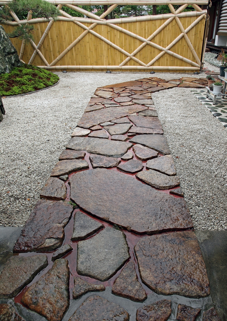 | 蘇えった造園直後の美しさ 山口さんは重森先生の庭の美しさを再現したいとの願望をついに実現した。 植栽の伐採、除草、竹垣の復元、白砂の入れ替え、延段の高圧洗浄による清掃などである。 山口さんは研究熱心なので白砂の選定から苔の選定まで研究の成果が発揮された。 |